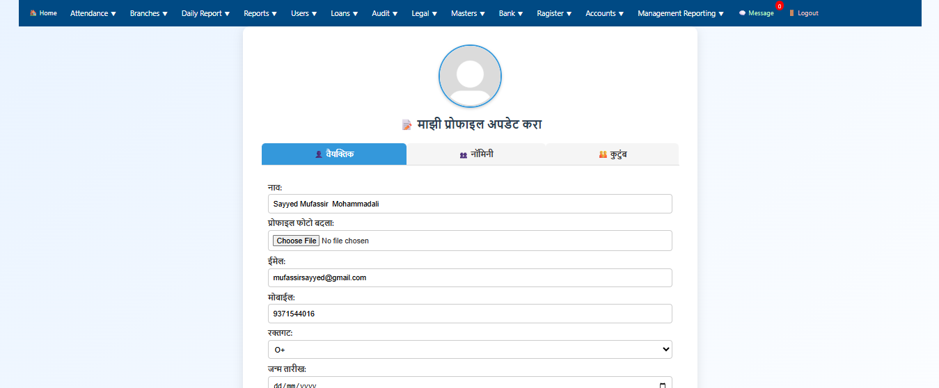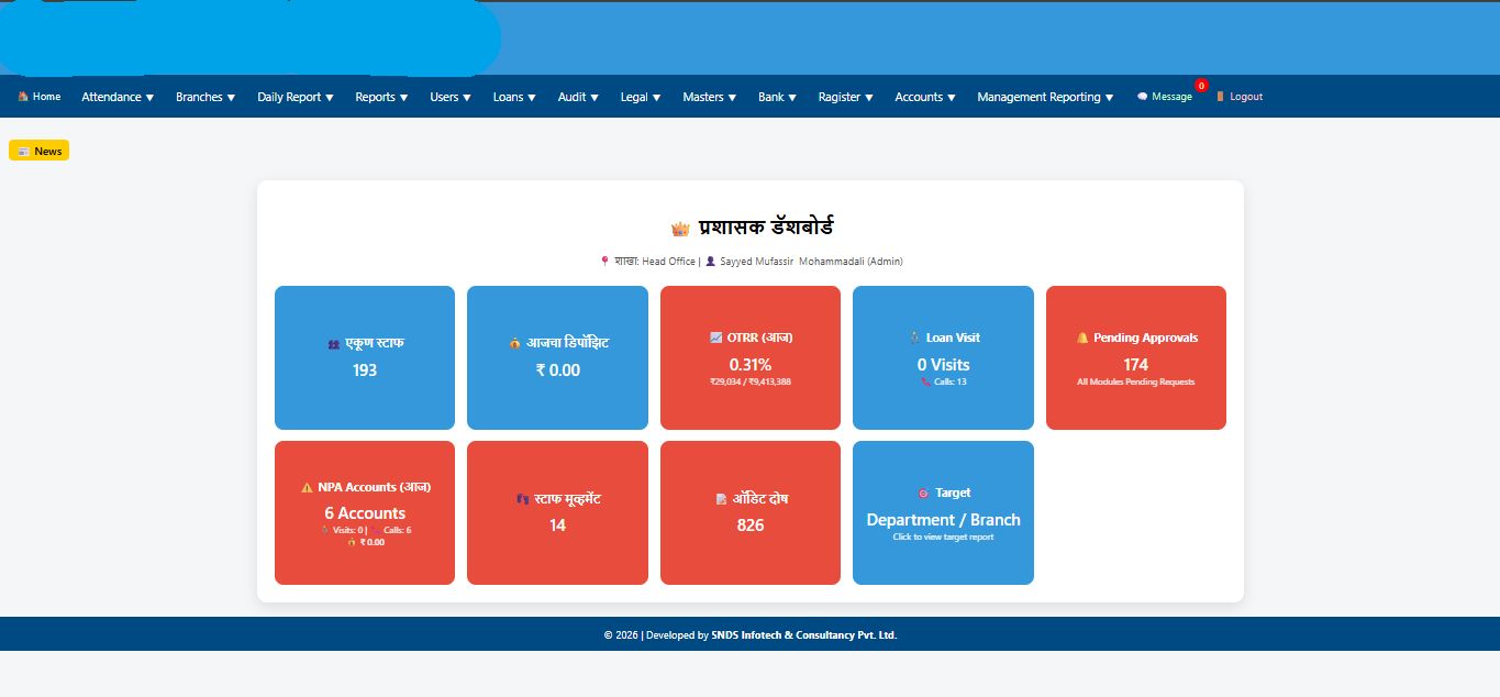 The system supports multiple banking modules including Loan Accounts, Gold Loan Management, Fixed Deposits (FD), Savings Accounts, and employee-related operations. It ensures accurate financial tracking, transparency, and compliance with organizational policies.
